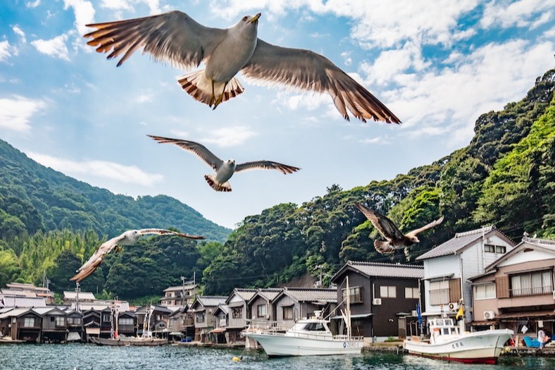 伊根湾へ移動し、遊覧船に乗って海上から舟屋群の独特な景観を巡ります。まるで海に浮かぶ家のような風景は、写真撮影に最高のスポットです。乗船料などに『海の京都コイン』をご利用いただけます。