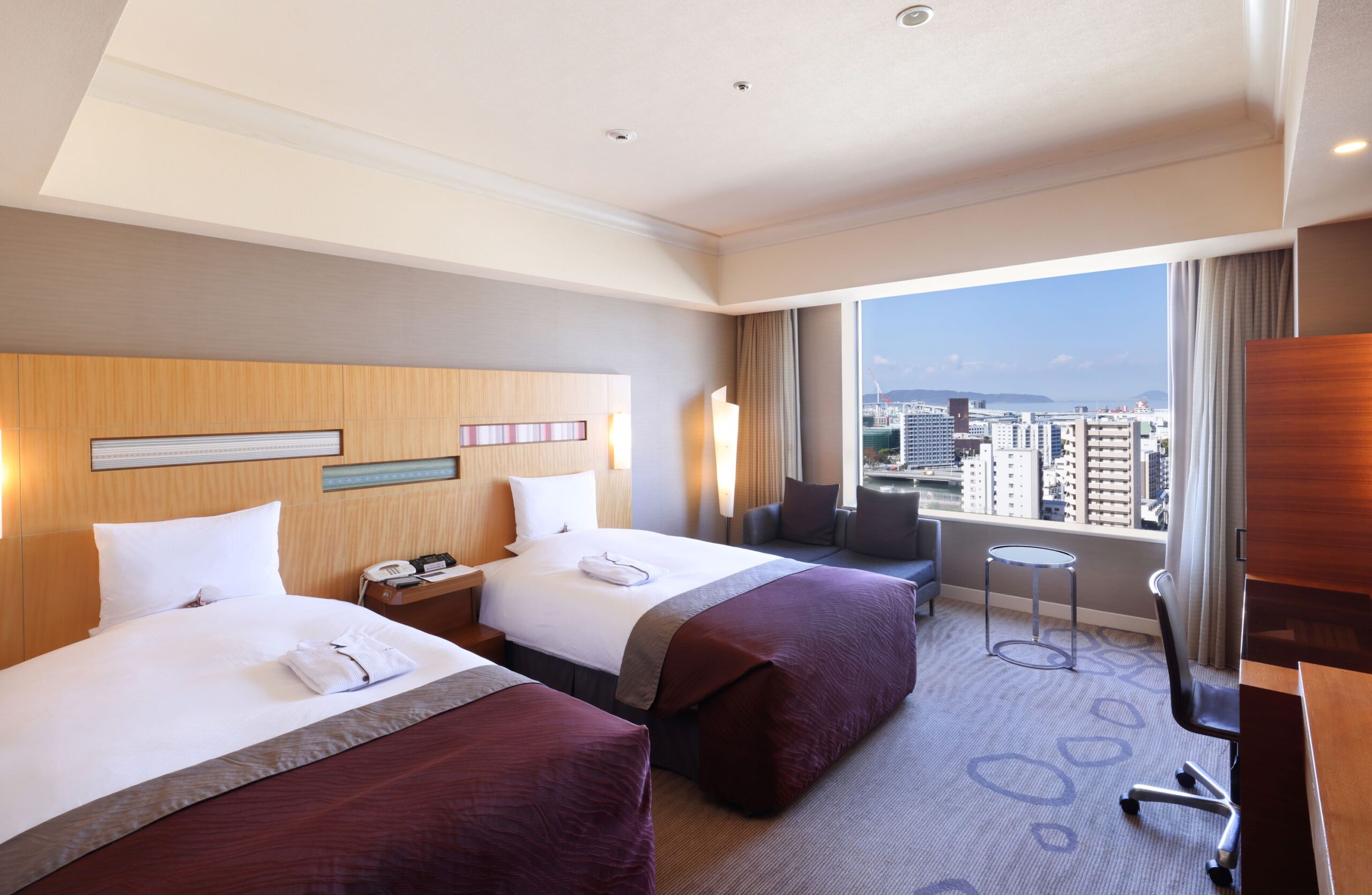 高層階に位置する客室からは、街並みや水辺、遠くの海まで見渡せる開放的な眺望が広がり、昼と夜で異なる表情を楽しめる点が魅力です。ゆとりある室内は落ち着いたデザインで、旅の疲れをゆっくりと癒やしてくれます。