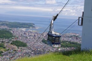 山麓と山頂を結ぶロープウエイは30人乗りのゴンドラで、約5分の空中散歩が楽しめます。運行間隔は通常12分ごと(繁忙期は6分ごと)で、移動中には小樽の街並みと石狩湾が眼下に広がり、まるで絵画のような眺望が広がります。山頂には五つの展望台が点在し、昼間は港町・小樽や積丹半島、遠くには暑寒別連峰まで一望できます。夜には無数の明かりが海辺を照らし出し、札幌の藻岩山や函館山と並ぶ「北海道三大夜景」としても親しまれています。きらめく光の帯が石狩湾の曲線を描き出す光景は、まさに息をのむ美しさです。