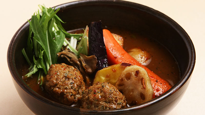【最後のパウダーを堪能し、〆のグルメへ】 チェックアウトを済ませ荷物を預けたら、心残りのないように午前中いっぱい滑り納めます。ニセコ東急グラン・ヒラフのゲレンデ周辺の人気店で、最後のランチはスープカレーを。スパイスと具材の旨味が体に染み渡る最高の〆グルメです。もちろん、お食事にも「俱知安e街ギフトKU-KURU」がご利用いただけます。